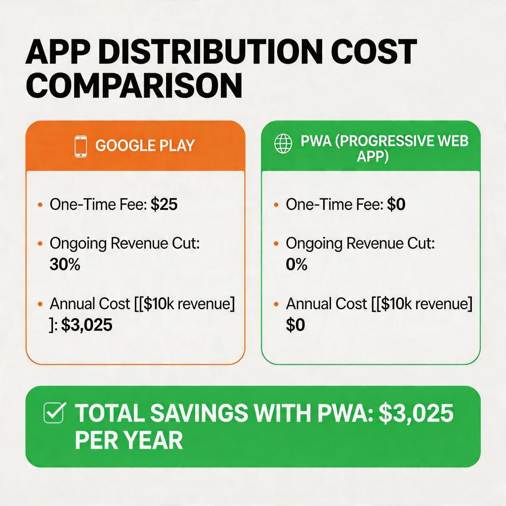 The critical point for distribution planning: this surcharge is applied on the advertising cost side, not on revenue from app distribution. That asymmetry is where PWA distribution starts to look not just interesting, but economically urgent.